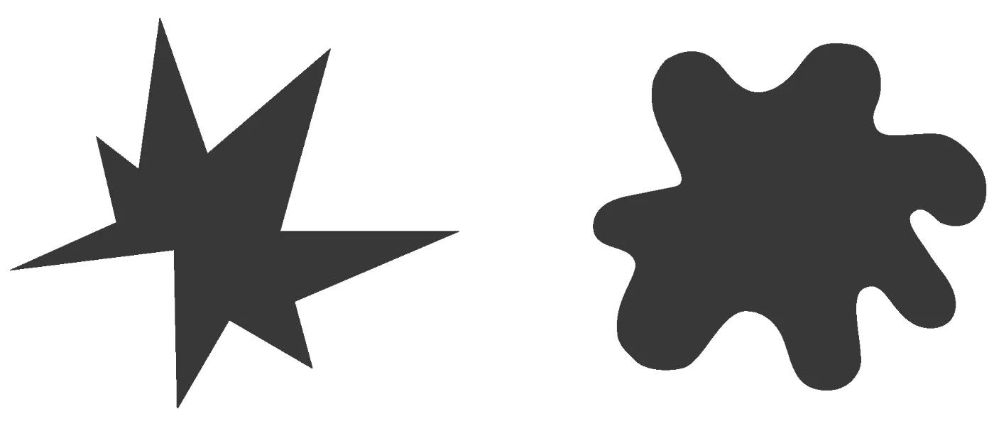 Most people, even on a worldwide scale, will associate the more rounded shape with bouba and the spiky shape with kiki. This bouba/kiki effect shows an association between speech sounds and visual shapes. And we can take that a step further – shapes can be signifiers for feelings. Designers can use rounded shapes to signify concepts like harmony or flow or comfort, and spiky shapes to signify roughness or immediacy or a sharp flavor.