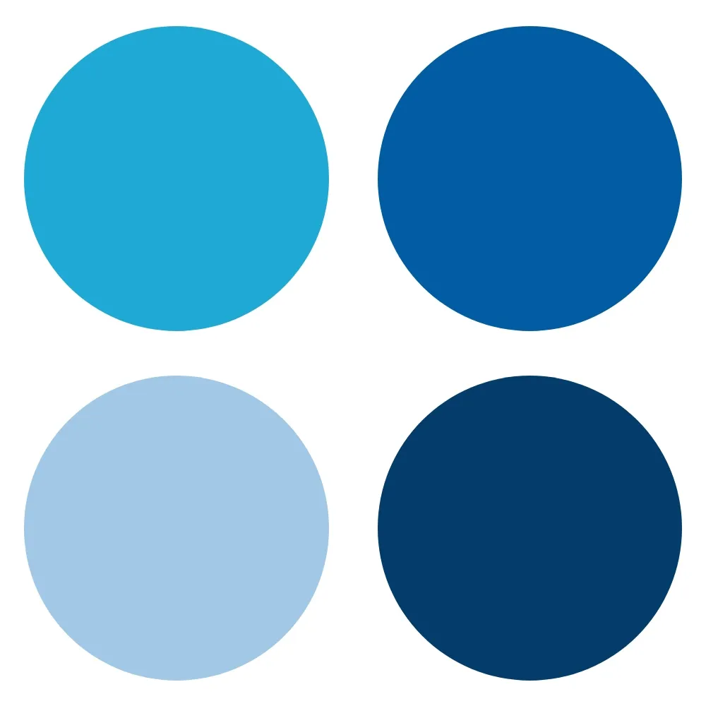 Blues in general tend to signify security, a sense of peace or calm, trust and stability. The darkest navy may remind you of a business suit. The lower left could be a blue sky. The brighter blue at the top left has more energy – it might feel younger. Or you may see a beautiful ocean color. The top right blue might feel classic or remind you of your bank. In just a small subset of blues we have lots of different feelings that we can signify depending on what’s appropriate. Designers are also using color in combination with other design elements to fine tune the feeling.