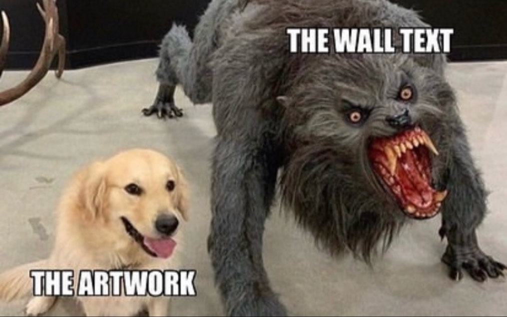 This is the truest meme I've ever seen. There is SO. MUCH. CONTEXT. And that can be a good thing, but I find it has become aggressive. There are literal paragraphs on the wall explaining to you a show before you even see the first artwork. My rule is I read nothing on my initial walkthrough. That way I can decide in my own head how to feel about a work. If I like it or not. What it means to me. Understand the timeline through the work itself. I'll go back through and read some of the context where I want it. Sometimes I like a work even more when I know more. Sometimes, say less. But I've allowed myself space to decide what it means to me first.