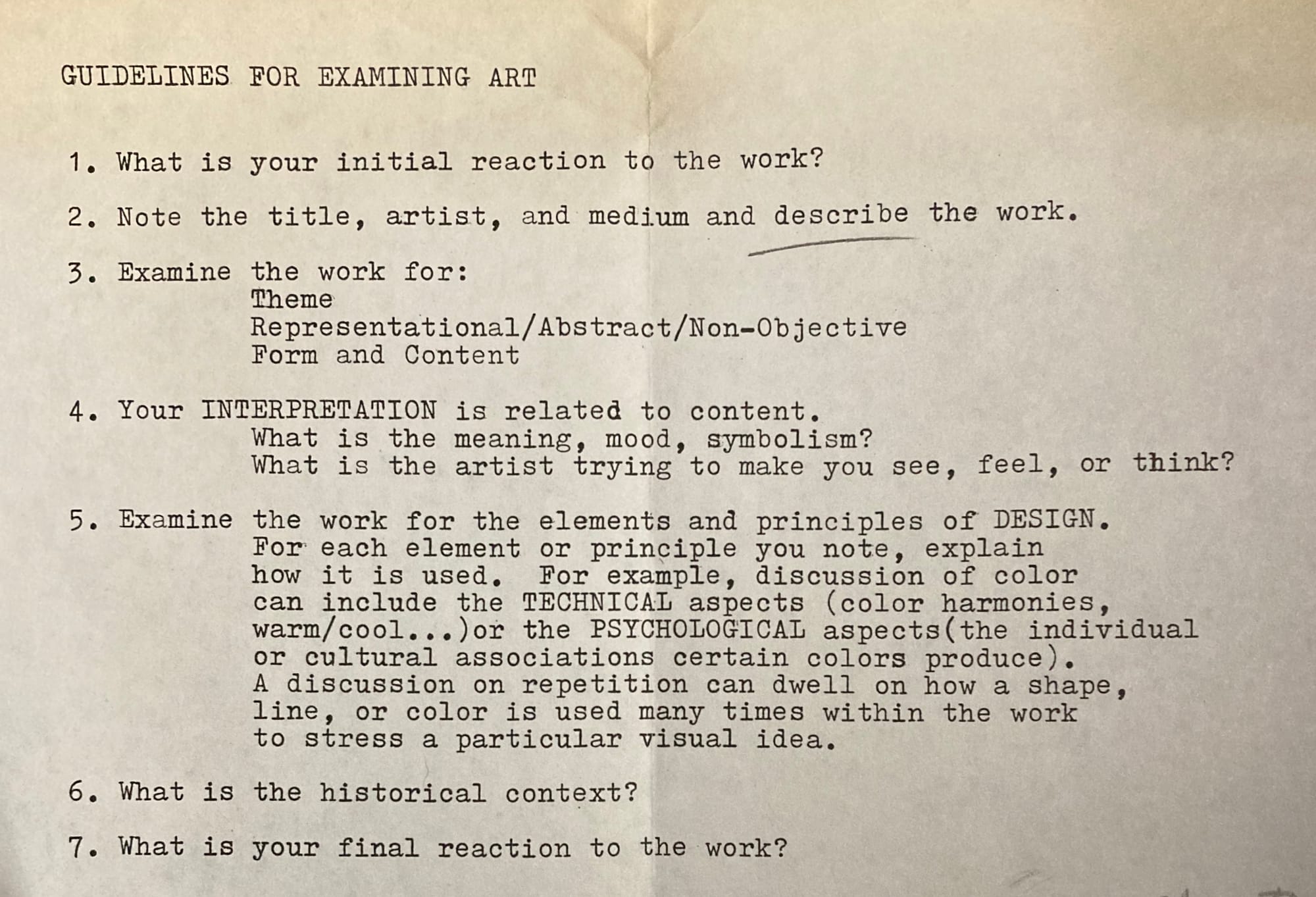 I have saved this since college because if you are not sure how to approach a work or want to spend time with it, this is great to refer to. You don't have to tick off every one. If something stops you online or on social media, this is an excuse to pause for a moment. This does not have to happen in the white walls of a gallery or museum. You don't have to write an essay about it. You do not need to query the internet. Whatever it means to you is correct. Take five minutes of art meditation time.