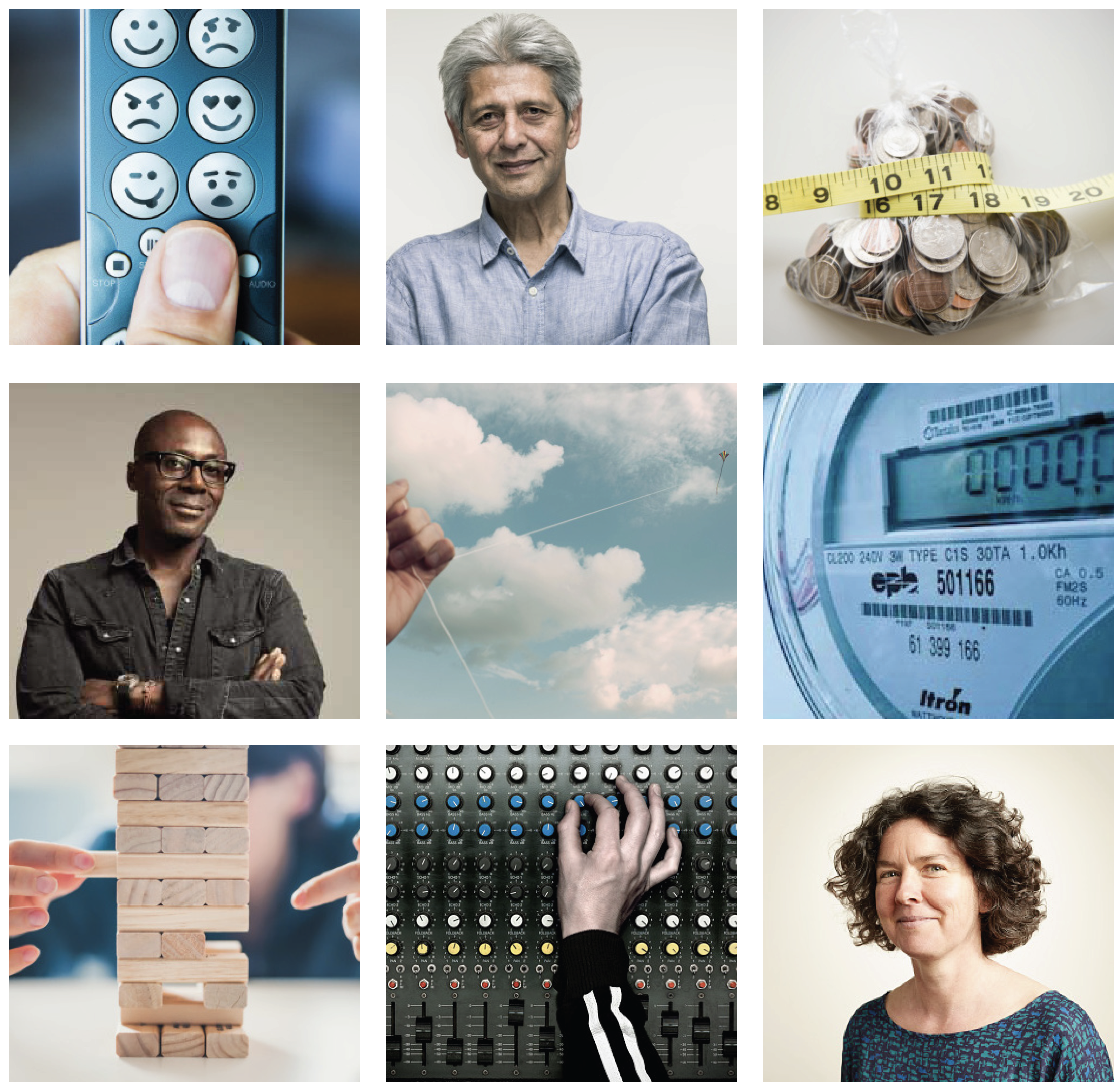 Therefore you see several signifiers of control – the panel with all the tiny knobs, the jenga, and the remote control which does double duty by sneaking in possible emotional states of the customer with the emojis. There is one nod to budget with the coins being squeezed. And one image of a utility meter to remind us that's the realm we're talking about. It can also signify control. The people are front and center in this concept as portraits to signify the human element that we're connecting to. All the images have intentionally been given a warm tone (another subtle layer). The sky and kite is also a little bit about control but it gives a sense of freedom and connects to possibilities. It is in the center intentionally.