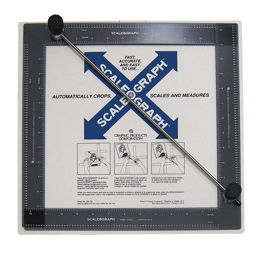 You would have a physical photograph, and on top of it you would use the tool below so that you could maintain the correct proportion of the shape of the placeholder space in your design. You would then use a grease pencil to make crop marks on the photograph where you wanted the printer to crop the image. Again, no loss of the original image. You would also use a proportional wheel to work out the percentage to enlarge or reduce the image, but that's math for another day.