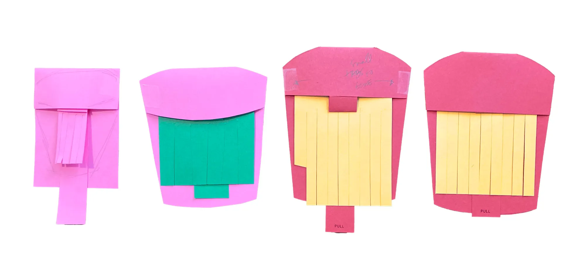 First, just to figure out how the mechanism would work. Then to figure out how to make it into something kind of like a pack of fries. There were about three rounds of creating the template, printing, prototyping, and going back to re-adjust. I want to show you the template layout, because of two technical items: