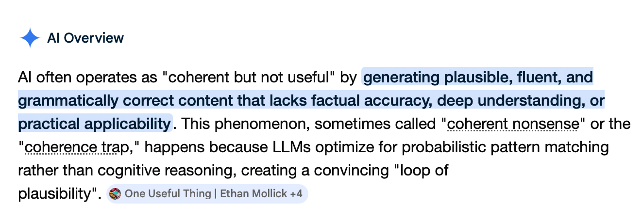 I’ve seen several instances of people using AI, and it will come up with a completely coherent, factual response. When you first read it, you say, yes this is great. However, once you sit down with it to think about the implications, you realize it’s actually not useful at all. It’s a strange feeling disconnect. And I think the reasons are the same – because these LLMs are also passing information through to you without actually understanding it. Coherence is not enough.