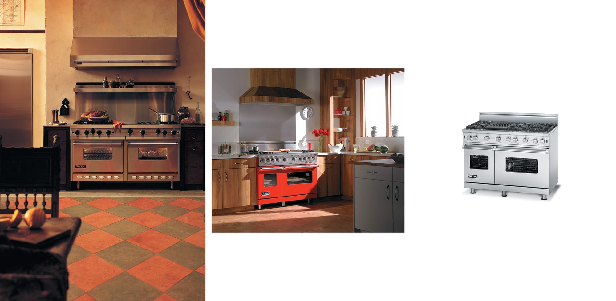 The Viking Range kitchen on the left is a full kitchen that spares no expense. The middle is a smaller vignette set that is still a cool design, but a little more practical. The right product image is only descriptive.