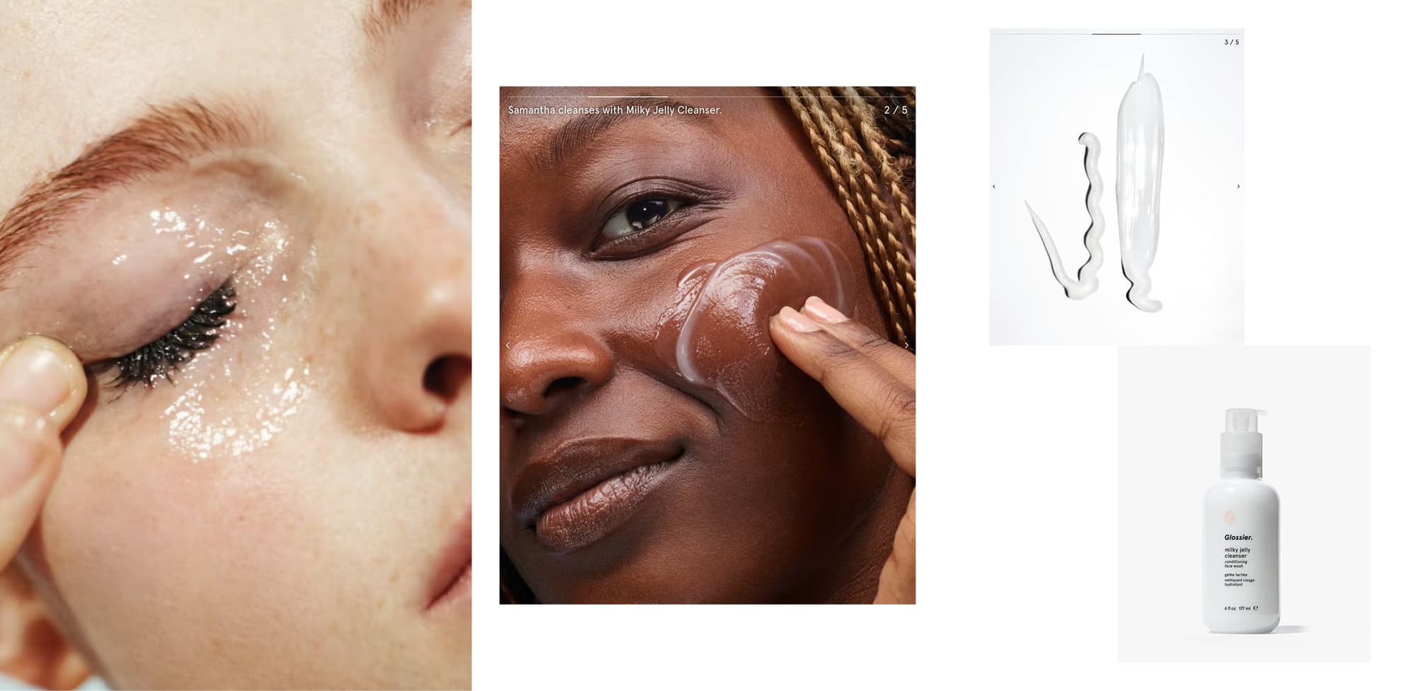 Here's an example from Glossier. The imagery on the left is a tad better quality in lighting, but the look of their brand imagery overall is a simple idea of bright and shiny which is easy to translate into Part II. This clean look with an emphasis on the textures of the products makes the very simple white on white Part III imagery make total sense.