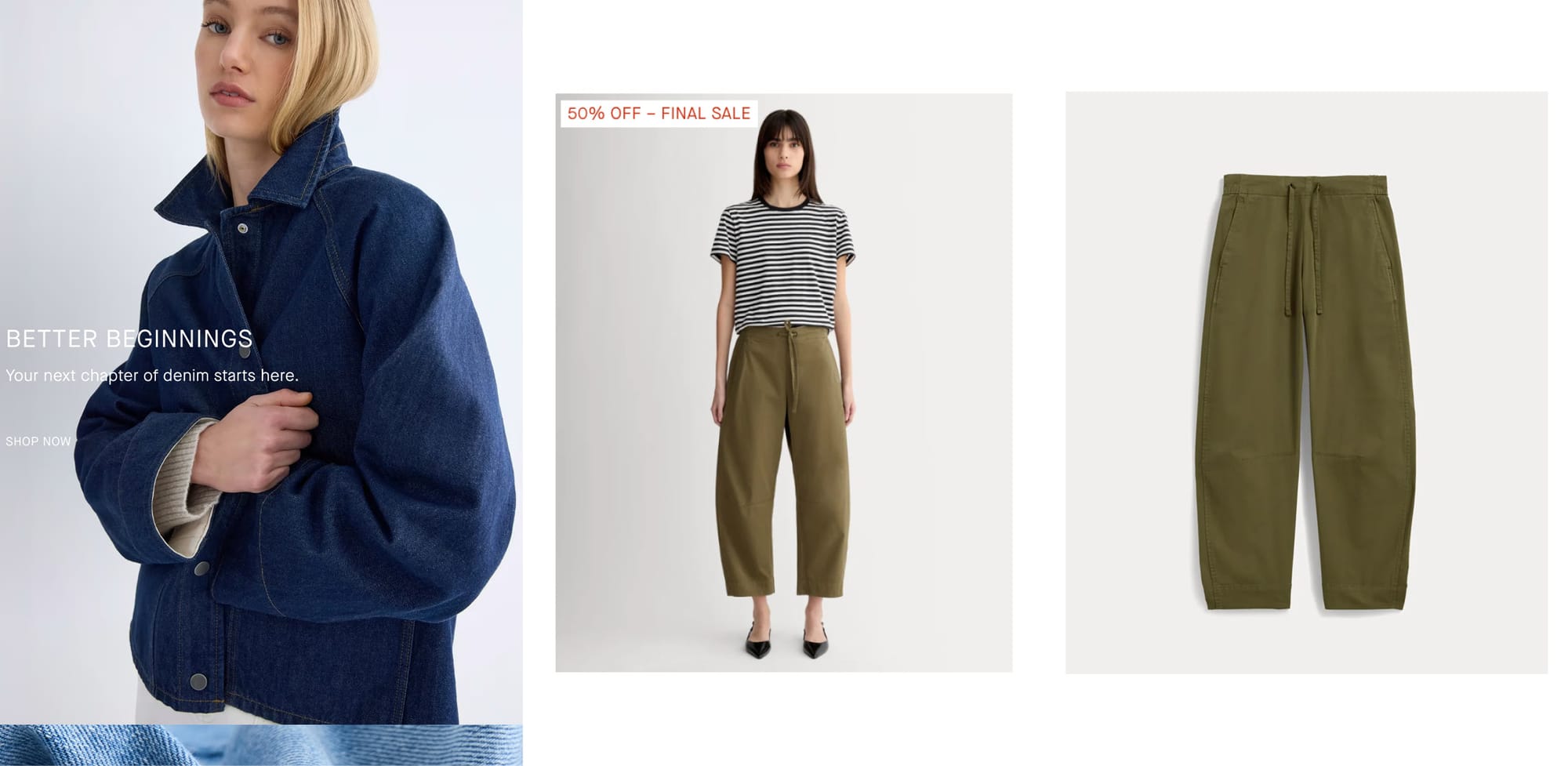 One more from Everlane because maybe it's the clearest example. All the images have the same minimalist vibe. But we go from model in an interesting pose to model in a straight forward pose, to just the pants ma'am.