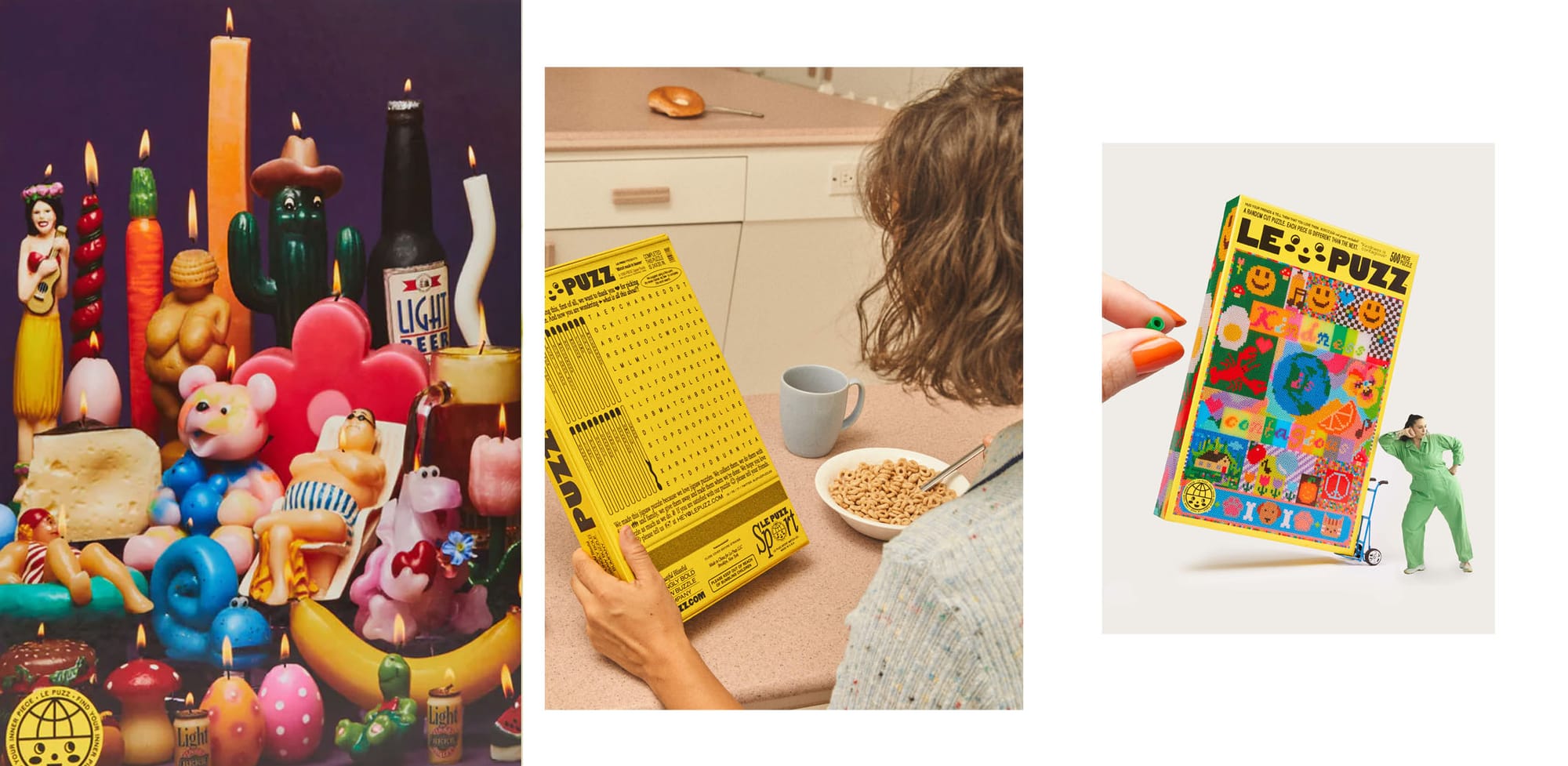 What about smaller brands? Le Puzz's Part I imagery is the artwork for the puzzles themselves. They're very different, but consistent in their slightly retro content, bright colors, and quirky themes. Their logo and brand color is so strong, it pulls everything together for me. Part II typically shows someone putting together a puzzle, or in this case, doing a puzzle on the back of the box. The cereal and tones again give nostalgic vibes (Do they still do put puzzles on the back of cereal boxes?). And their Part III is typical, but with a little twist which is on brand for them.